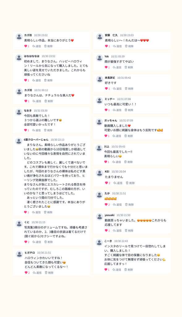 今回も感想の通知が鳴り止まなかったと思います。それでも、まりなさんが私を含めたくさんのファンのコメントに一つづつ丁寧にコメントされる—本当に嬉しいですし、まりなさんの優しさを感じます。
