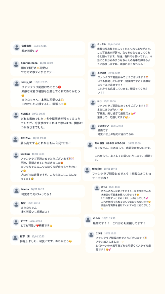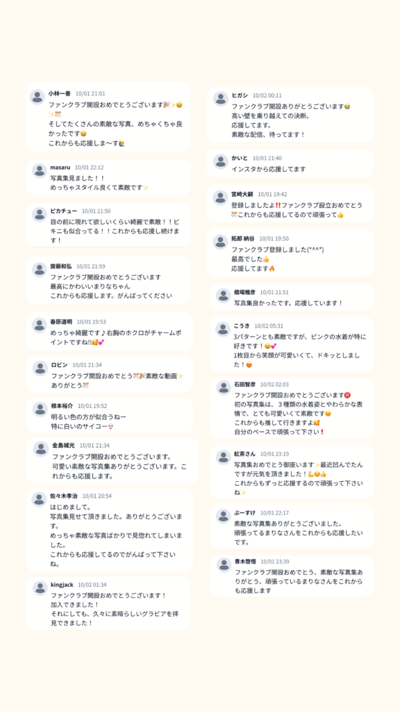 読んでて心が温かくなりました、まず、ファンクラブを開設して新しい気持ちが芽生えたってところ、本当に素敵だなって思います。まりなちゃんが、特別な空間で、自分を表現したいって思う気持ち、めちゃくちゃ伝わってきて、こっちまでワクワクしちゃいました。怖さや不安があるのに、それでも一歩踏み出そうとする姿が、めっちゃ勇気もらえますよ。確かに、いつも応援してくれるみんなの前で、ありのままを出していくのって、ドキドキするけど、それがきっと一番輝く瞬間になるんじゃないかな、まりなちゃんが、そう思える場所を作れたこと自体が、すごい成就だと思うんです